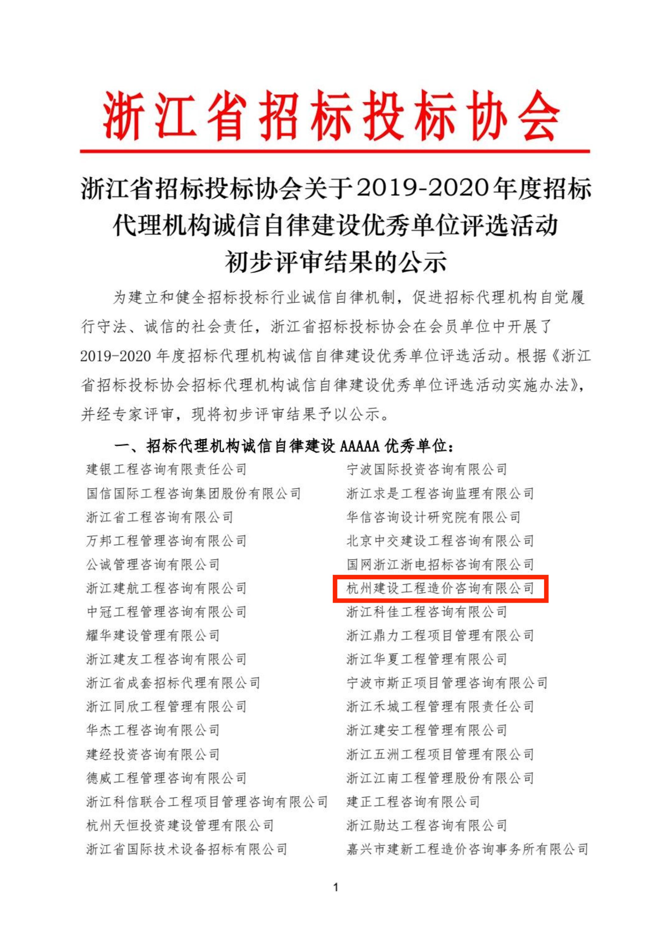 浙江省工程造价咨询企业动态信用能力AAAAA