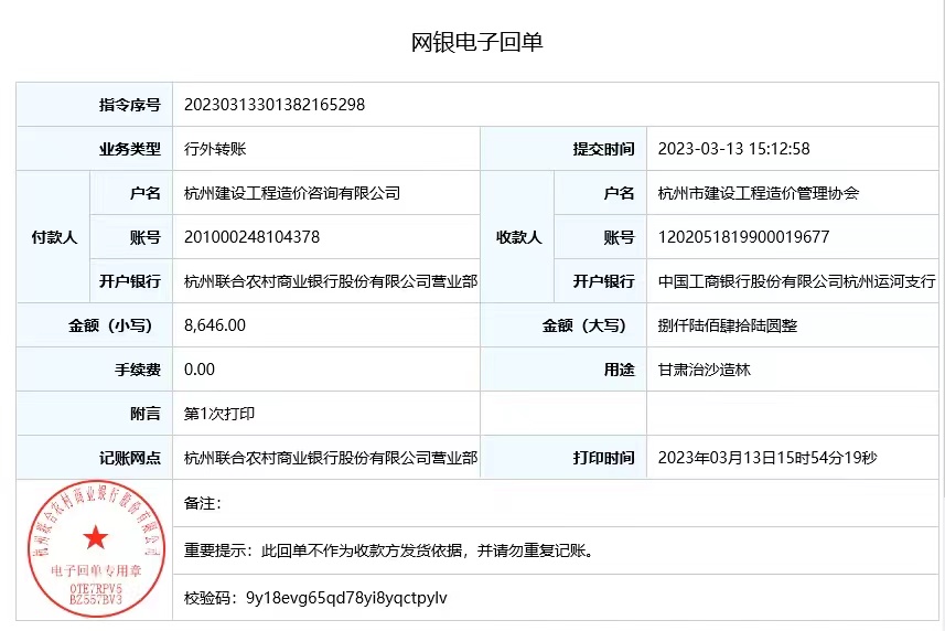 绿水青山就是金山银山,植树造林、绿化家园,功在当代、利在千秋。我们心系民勤治沙,希望能在杭州市招标造价行业的带领下,携手全体员工一起为民勤县的治沙捐献出一份自己的力量。