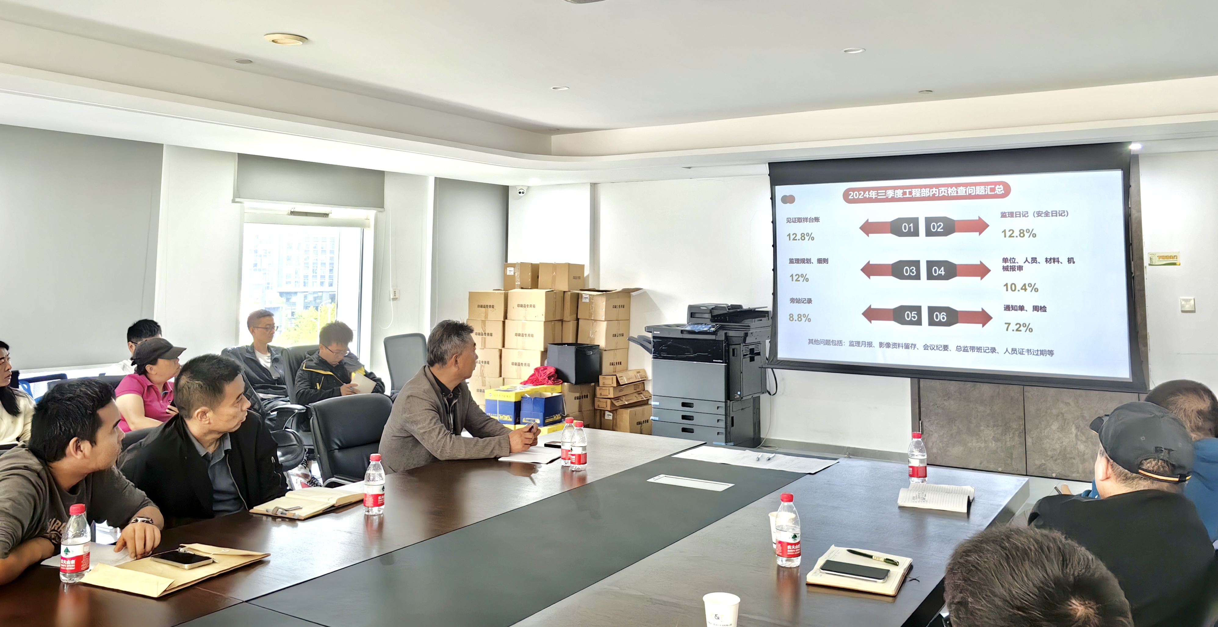 会议首先回顾了近期举行的大会和培训,由工程部汇报第三季度各项目巡查情况,指出了现场存在的一些质量、安全和资料问题。并且,工程部还对季度检查出现的问题进行了数据汇总计算,统计了重点问题发生百分比,提醒各项目未来应着重留意这些易出现异常的方面。除此之外,工程部还对下季度将要举行的培训或会议进行了梳理。