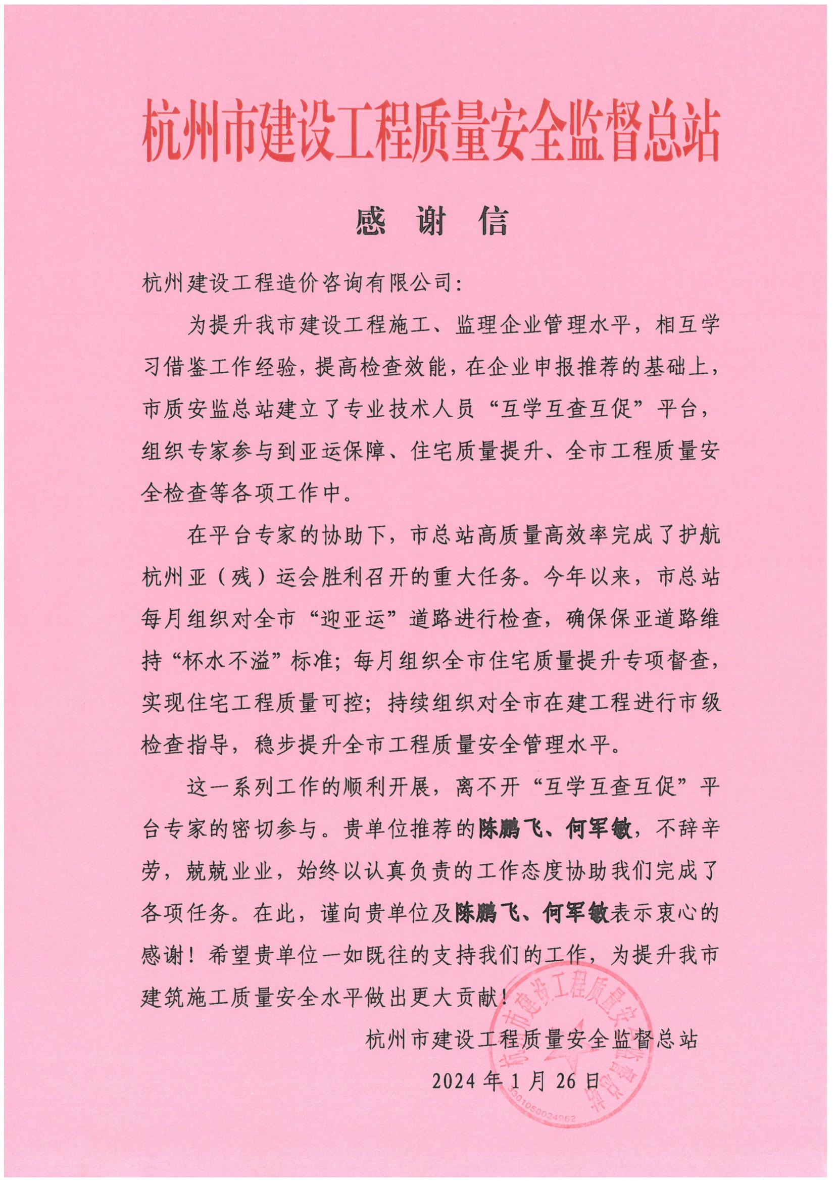 3.杭州市建设工程质量安全监督总站感谢信