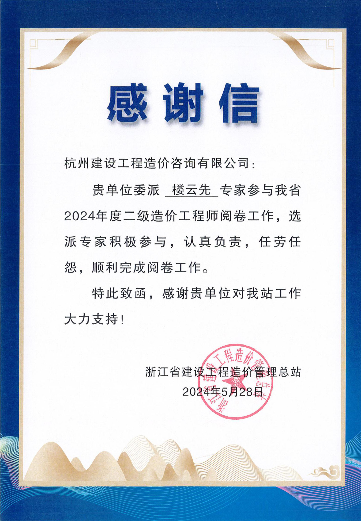 2.楼云先2024年度二级造价工程师阅卷感谢信
