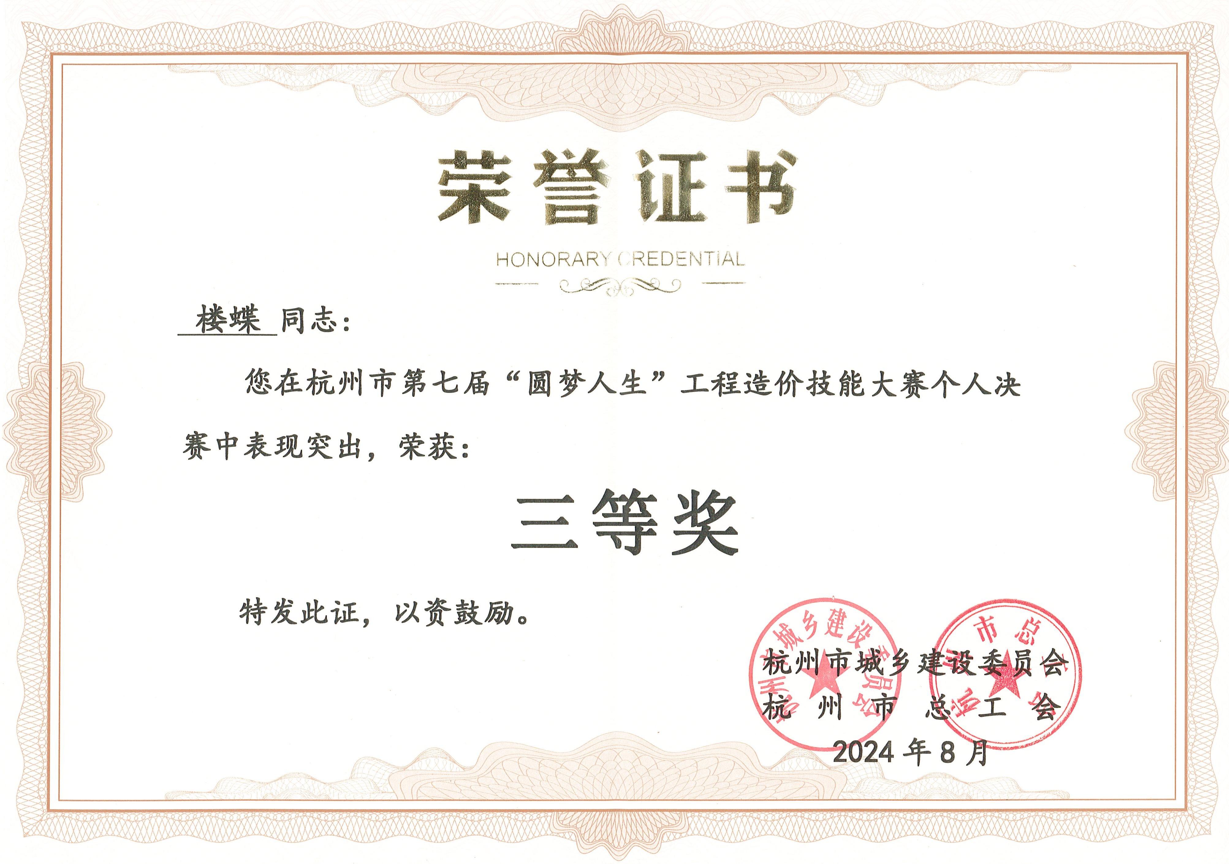 3.楼蝶杭州市第七届“圆梦人生”工程造价技能大赛个人决赛三等奖