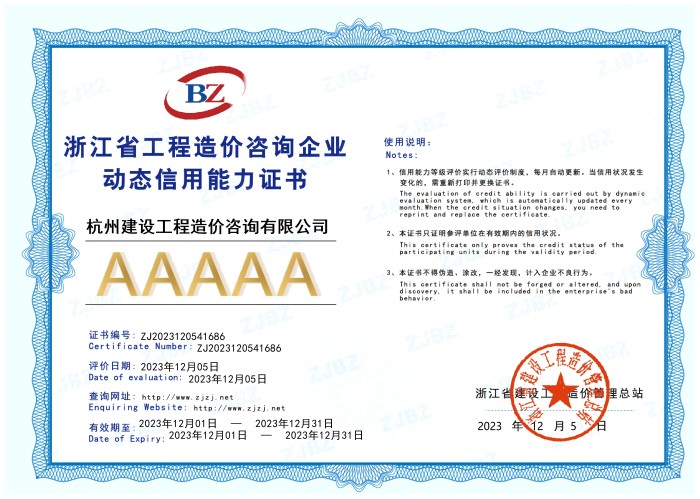 浙江省工程造价咨询企业动态信用能力AAAAA