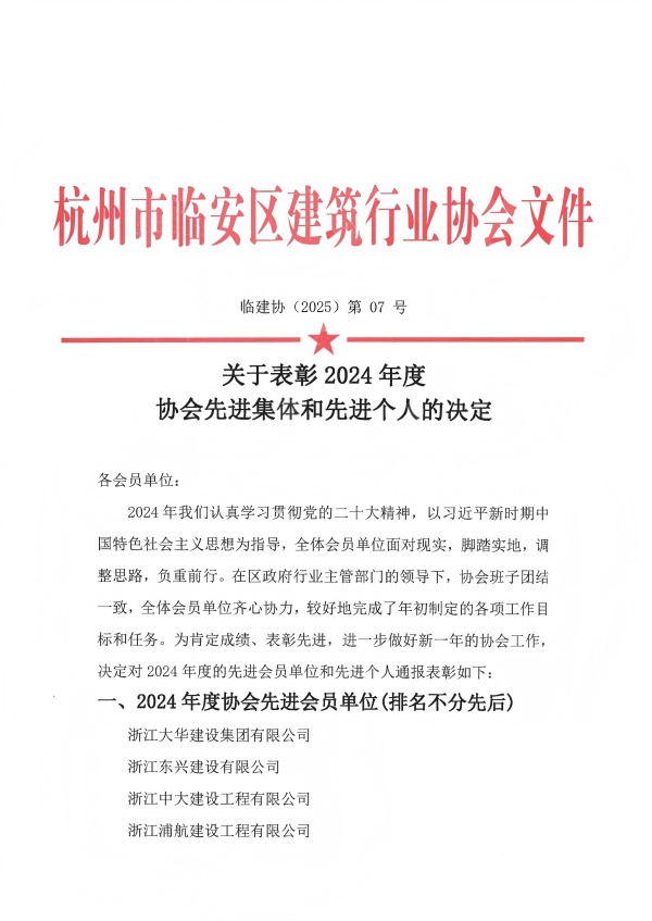 杭州市临安区建筑行业协会2024年度协会先进会员单位